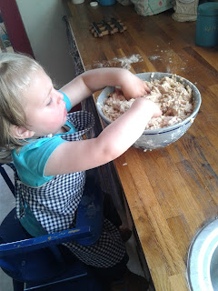 | Der laves frikadeller. Hænderne er naturligvis vasket grundigt |