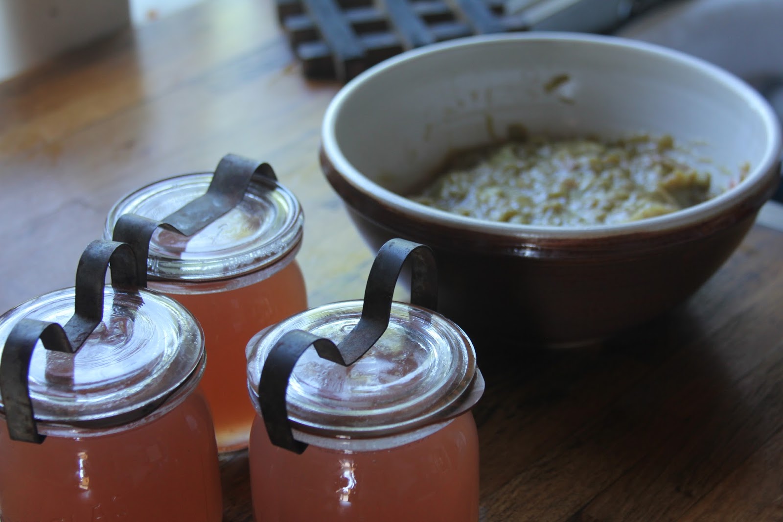 Når rabarberne er kogt godt bløde, sies væden fra og frugtkødet sættes til side (ikke smide ud).