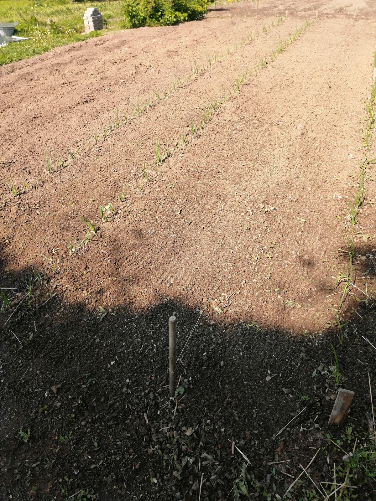 | Det er svært at se, men her står vores løg. Gulerødderne er ikke kommet op endnu. |