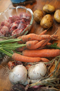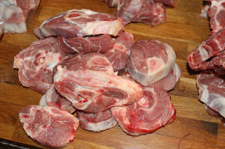 Jeg har det sådan hver gang vi har slagtet skal vi smage det dejlige kød med det samme, så i aften står den på osso buco. Det er lækker simremad og dertil kommer jeg vore egne nyopgravet gulerødder i og vore løg som jeg lige har hentet i stalden.