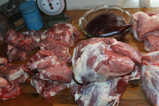 af slagtningen fik vi , 2 rygstege, koteletter, osso buco, slag, hjerte, lever, nyre, rigbensteg, grydestege, køller mm.